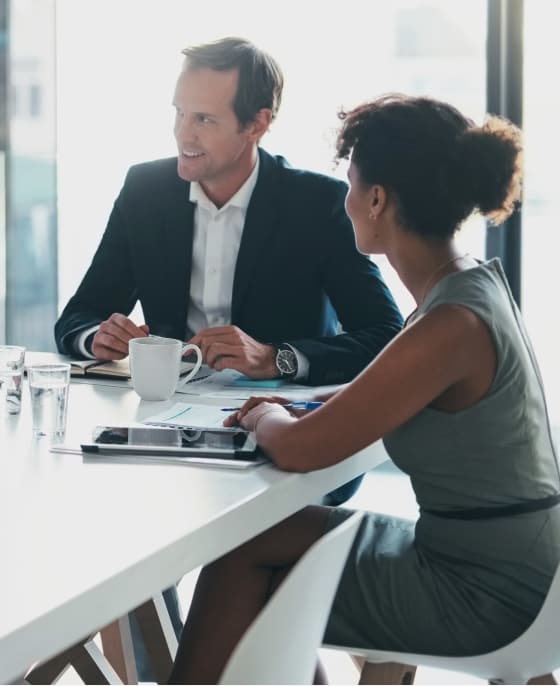 [Man interviewing woman in office.]